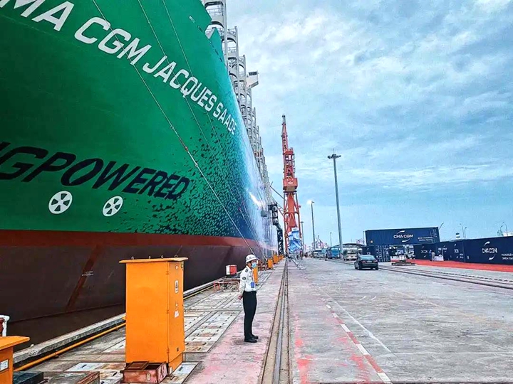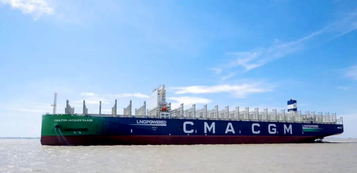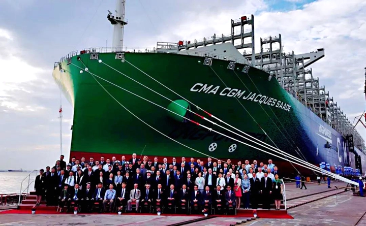 9月22日,中國(guó)船舶集團(tuán)有限公司旗下滬東中華造船(集團(tuán))有限公司和中國(guó)船舶工業(yè)貿(mào)易有限公司作為聯(lián)合賣方,為世界著名航運(yùn)公司——法國(guó)達(dá)飛集團(tuán)建造的世界首艘23000TEU雙燃料動(dòng)力集裝箱船“達(dá)飛雅克·薩德”號(hào),在上海長(zhǎng)興島造船基地命名交付。