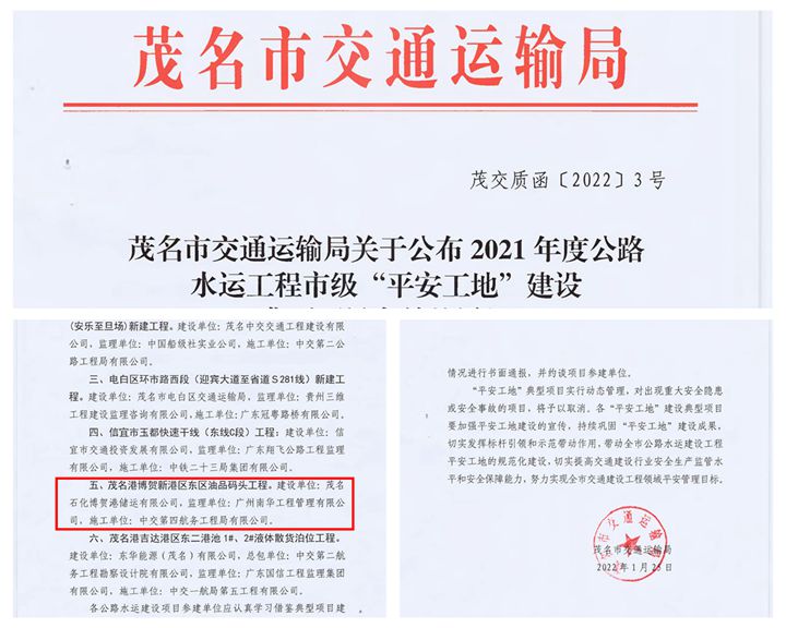 近日,茂名市交通運輸局在全市公路水運項目中部署開展平安工地建設考核工作。經過層層遴選,茂名港博賀新港區(qū)東區(qū)油品碼頭工程再次被評為市級“平安工地”建設典型項目,連續(xù)兩年榮獲“平安工地”稱號!