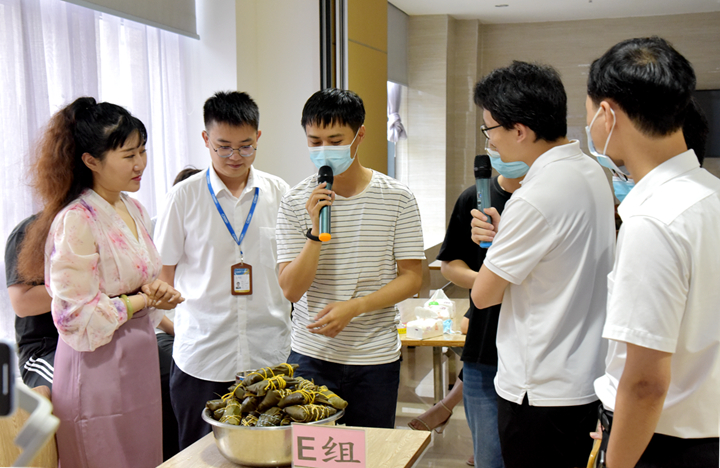 包粽子比賽通過人員交叉搭配進(jìn)行分組比賽。在嫻熟的“老手”作現(xiàn)場示范講解后,各組隊員紛紛動手上陣。只見組員之間分工合作、相互配合,折粽葉、裝糯米、放餡料、裹扎繩……大家紛紛拿出自己的“拿手絕活”。30分鐘的比賽里洋溢著歡聲笑語,各位選手巧手翻飛,一個個形態(tài)各異的粽子瞬間成型。最后,大會裁判以“速度、質(zhì)量、美觀、衛(wèi)生”為評判標(biāo)準(zhǔn)對各組粽子進(jìn)行了評選。