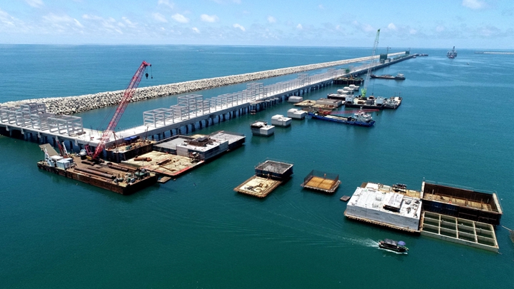 3×5萬噸級(jí)油氣化工碼頭項(xiàng)目港池疏浚已完成,沉箱預(yù)制完成86%、安裝完成54%,胸墻澆筑完成26%,項(xiàng)目總體進(jìn)度完成63%;