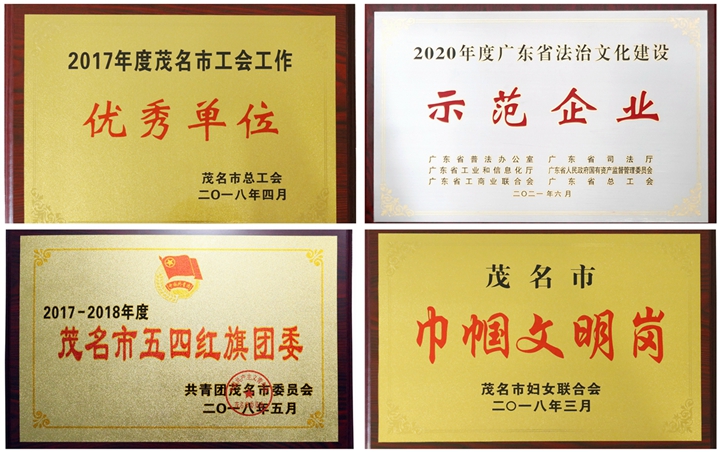 ▲集團(tuán)榮譽(yù)獎(jiǎng)牌(摘選) 幾年來(lái),集團(tuán)工會(huì)榮獲“茂名市工會(huì)工作優(yōu)秀單位”稱(chēng)號(hào),集團(tuán)財(cái)務(wù)部女職工榮獲“茂名市巾幗文明崗”稱(chēng)號(hào);集團(tuán)團(tuán)委成立青年志愿者服務(wù)隊(duì),助力雙創(chuàng)工作,連續(xù)三年榮獲“茂名市五四紅旗團(tuán)委”稱(chēng)號(hào)。集團(tuán)憑借系列企業(yè)文化建設(shè)成果,先后榮獲 “中國(guó)企業(yè)文化建設(shè)典范企業(yè)”“廣東省先進(jìn)集體”“廣東省優(yōu)秀企業(yè)”“廣東省企業(yè)文化建設(shè)最佳實(shí)踐單位”“廣東省法治文化建設(shè)示范企業(yè)”等榮譽(yù),被譽(yù)為茂名市屬?lài)?guó)有企業(yè)的標(biāo)桿與典范。 結(jié)語(yǔ) 十年積跬步,足下至千里;仨甑姆欠舱鞒蹋廴耸钢酒D苦奮斗,勇于擔(dān)當(dāng)作為,爭(zhēng)當(dāng)茂名向海而興排頭兵,在茂名經(jīng)濟(jì)發(fā)展史上留下堅(jiān)實(shí)的足印。