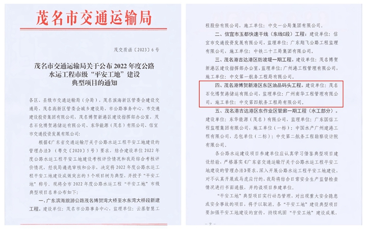 2月2日,茂名市交通運輸局下發(fā)《茂名市交通運輸局關(guān)于公布2022年度公路水運工程市級“平安工地”建設(shè)典型項目的通知》文件,對2022年度公路水運工程平安工地建設(shè)成效突出的項目進行表彰通報。集團建設(shè)的茂名港博賀新港區(qū)東區(qū)油品碼頭工程獲評“平安工地”稱號,這已是油品碼頭工程連續(xù)3年榮獲該項榮譽。