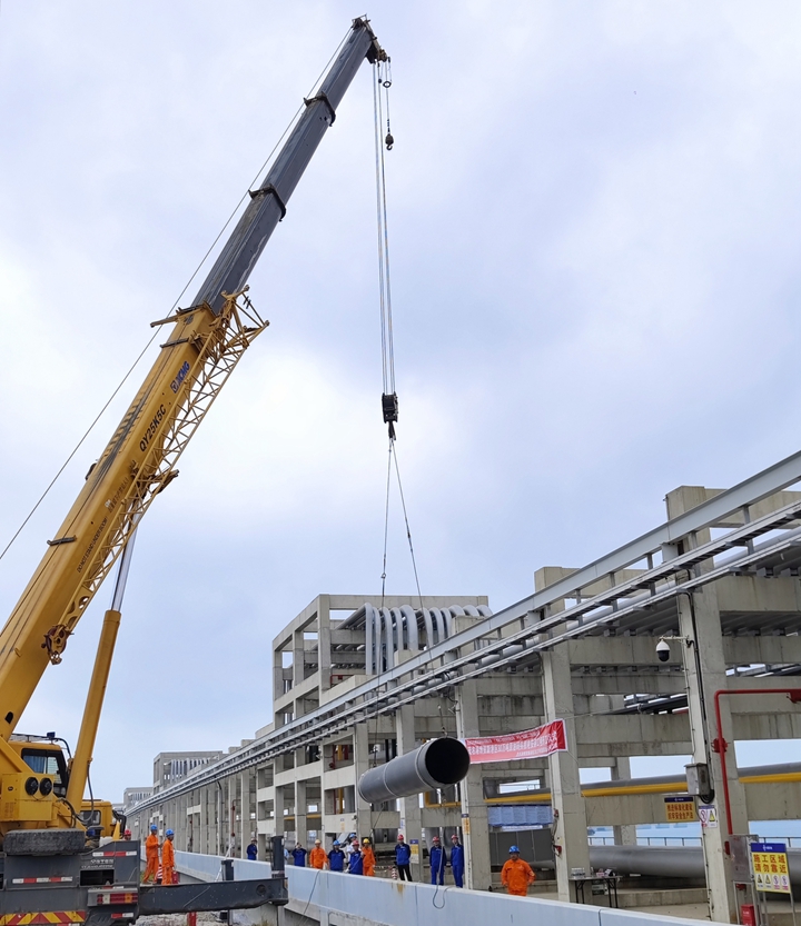 據(jù)悉,30萬噸級原油碼頭工程設(shè)置2根DN900的原油運輸主管,起點為30萬噸級原油碼頭E1泊位,終點為東防波堤堤根的公用管廊終點,原油管線總長度約為6km,此次施工吊裝的首根原油管道長約12.29米,重約3.46噸。公共管廊處管線多,作業(yè)空間狹隘,需要在保護(hù)已有管線設(shè)備的前提下進(jìn)行安全精準(zhǔn)化吊裝作業(yè),對此,臨時黨支部多次協(xié)調(diào)組織監(jiān)理單位、施工單位和運營單位的專業(yè)人員提前規(guī)劃管道吊裝方案,協(xié)調(diào)組織各方專業(yè)人員現(xiàn)場值守,從而保障管道吊裝作業(yè)安全可控地順利開展。