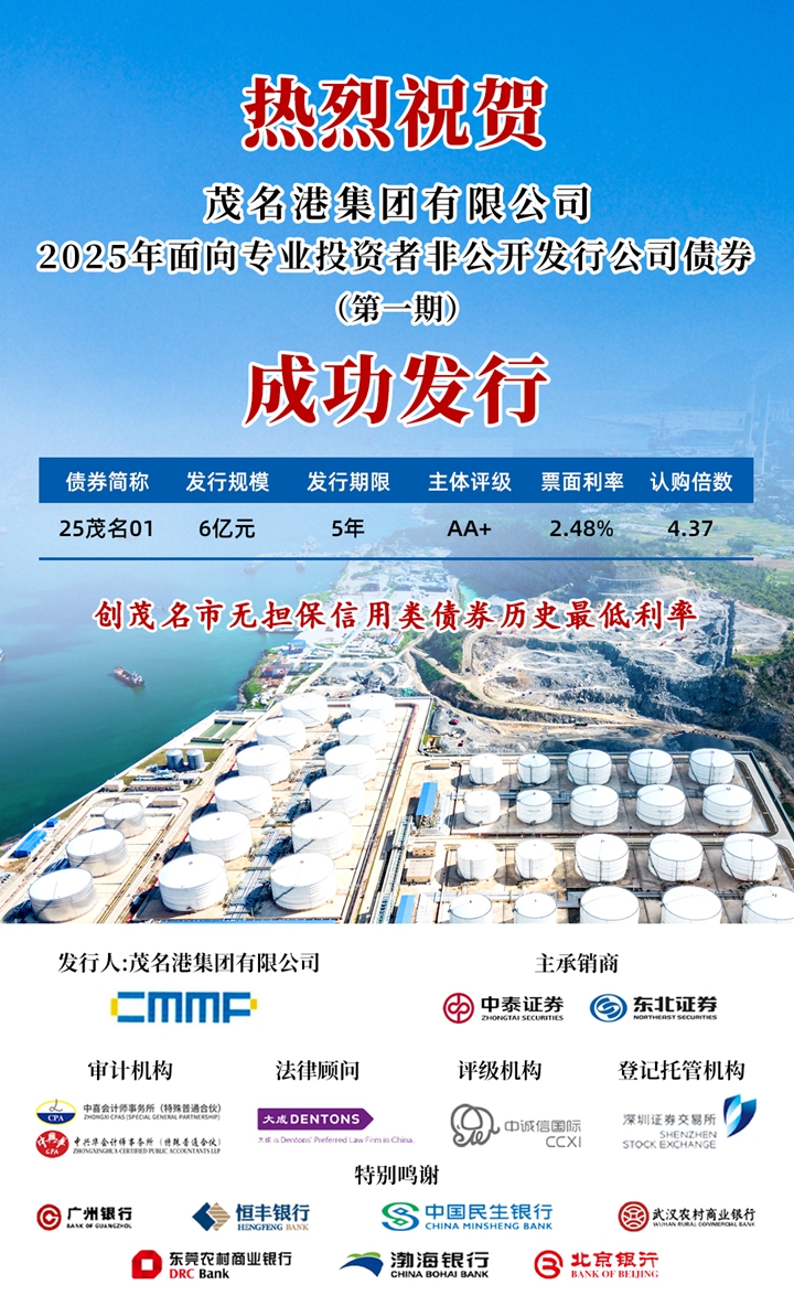 4月17日,茂名港集團(tuán)成功發(fā)行2025年度“25茂名01”公司債券。本期債券發(fā)行規(guī)模為6億元,債券期限為5年期,最終票面利率定格在2.48%,全場認(rèn)購倍數(shù)4.37倍,本期債券由中泰證券股份有限公司擔(dān)任簿記管理人。