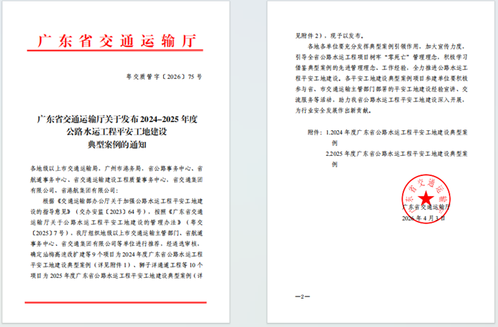 據(jù)悉,本次典型案例遴選嚴(yán)格依據(jù)《交通運(yùn)輸部辦公廳關(guān)于加強(qiáng)公路水運(yùn)工程平安工地建設(shè)的指導(dǎo)意見》(交辦安監(jiān)〔2023〕64 號)及《廣東省交通運(yùn)輸廳關(guān)于公路水運(yùn)工程平安工地建設(shè)的管理辦法》(粵交〔2025〕7 號)文件要求,由廣東省交通運(yùn)輸廳組織地級以上市交通運(yùn)輸主管部門、省航道事務(wù)中心、省交通集團(tuán)有限公司等單位聯(lián)合推薦,經(jīng)多輪嚴(yán)格遴選審核后最終確定,全省僅9個項目入選2024年度典型案例,充分彰顯了本次榮譽(yù)的含金量。